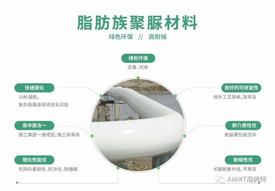 青島海洋新材料自主研發(fā)的聚脲/聚氨酯管道防腐材料在行業(yè)領(lǐng)域應(yīng)用頗為突出,具有壽命長(zhǎng)、綠色環(huán)保、一體成型無(wú)縫連接等性能。我公司防腐材料執(zhí)行歐美國(guó)際標(biāo)準(zhǔn),直飲水管道防腐材料通過(guò)英國(guó)WRc-NSF及山東省衛(wèi)生和計(jì)劃生育委員會(huì)頒發(fā)的飲用水認(rèn)證證書(shū)。