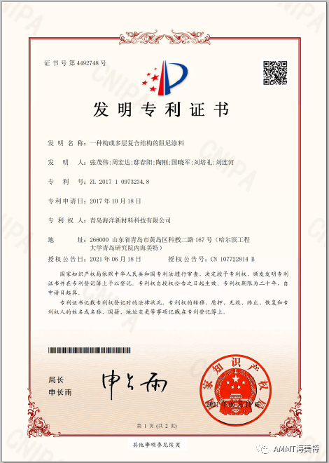 2021年6月18日,青島海洋新材料科技有限公司申請的“一種構(gòu)成多層復(fù)合結(jié)構(gòu)的阻尼涂料”發(fā)明專利獲得國家知識產(chǎn)權(quán)局授權(quán),授權(quán)專利號:ZL 2017 1 0973234.8。目前,公司共獲得國家授權(quán)專利32項(xiàng),其中發(fā)明專利30項(xiàng),實(shí)用新型專利1項(xiàng),外觀設(shè)計專利1項(xiàng)。